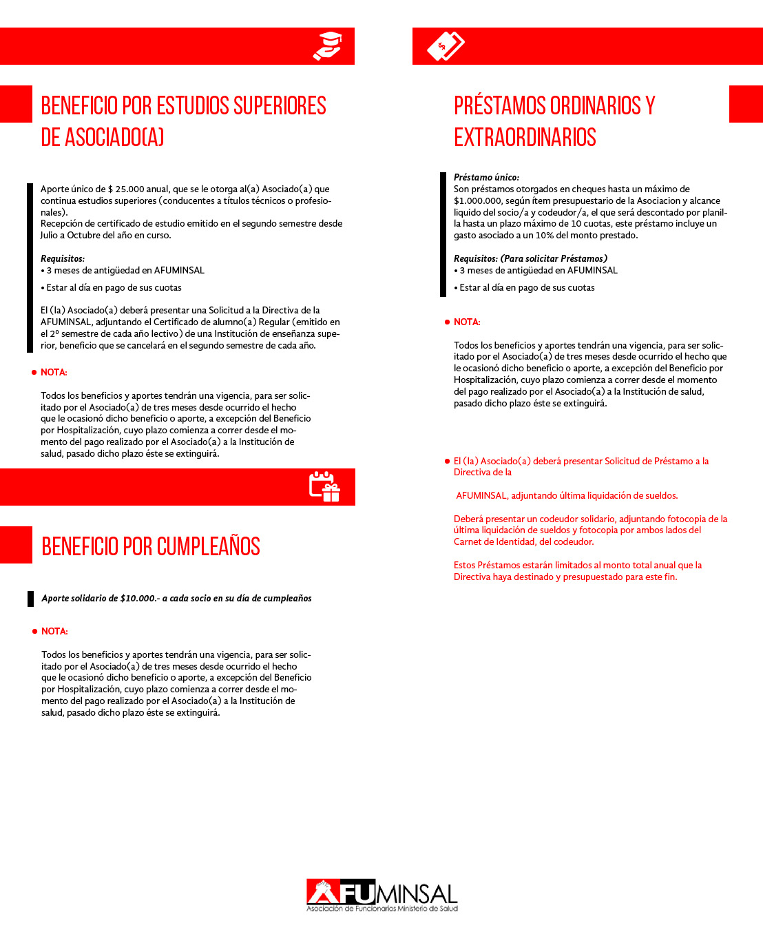 Todos los beneficios y aportes tendrán una vigencia, para ser solicitado por el Asociado(a) de tres meses desde ocurrido el hecho que le ocasionó dicho beneficio o aporte, a excepción del Beneficio por Hospitalización, cuyo plazo comienza a correr desde el momento del pago realizado por el Asociado(a) a la institución de salud, pasado dicho plazo éste se extinguirá.